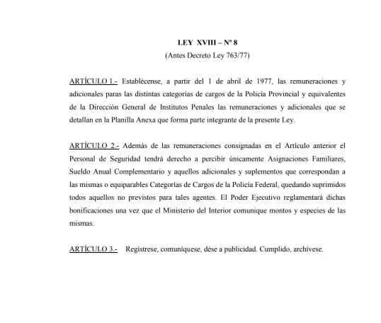 Esta ley de la dictadura militar, aparentemente nunca fue derogada, por lo que hoy resulta un "hecho nuevo" sobre el que se sustenta parte del reclamo salarial de los agentes de seguridad provinciales. Las comparaciones de sueldos de hoy, evidencian una brecha notoria. Según esta norma el modelo de liquidación de los sueldos debería contemplar esta modalidad; el expediente está listo para entregarse al gobierno provincial, en la mesa de negociaciones.